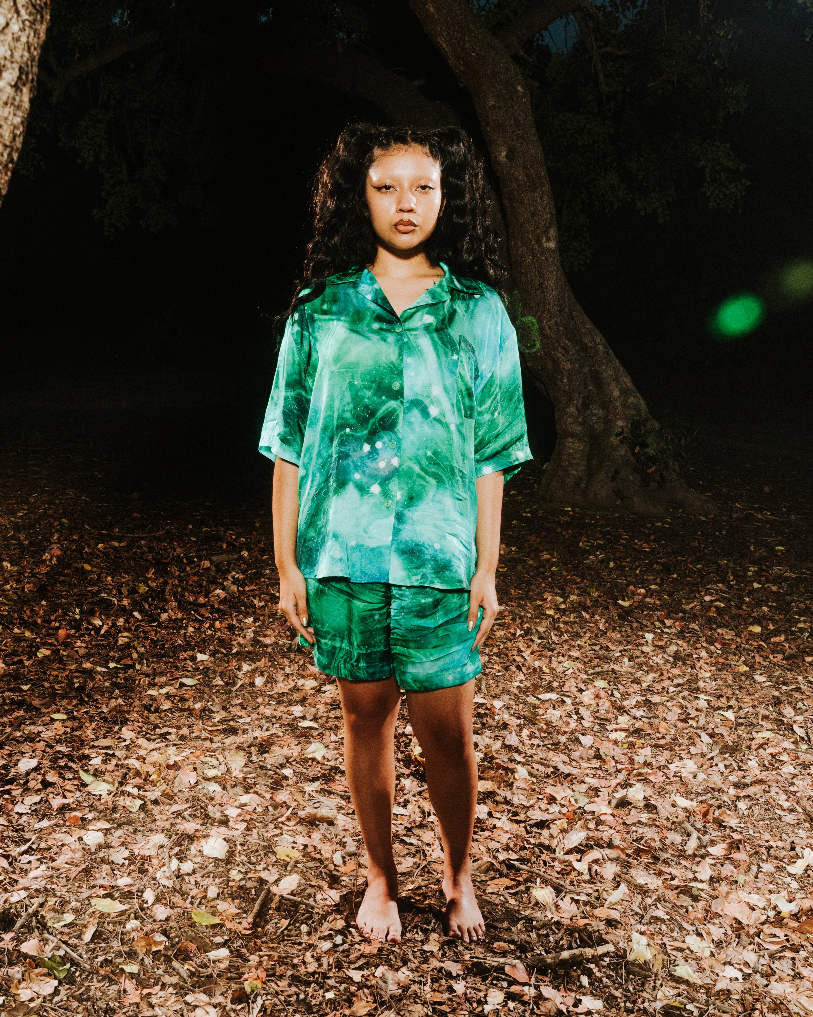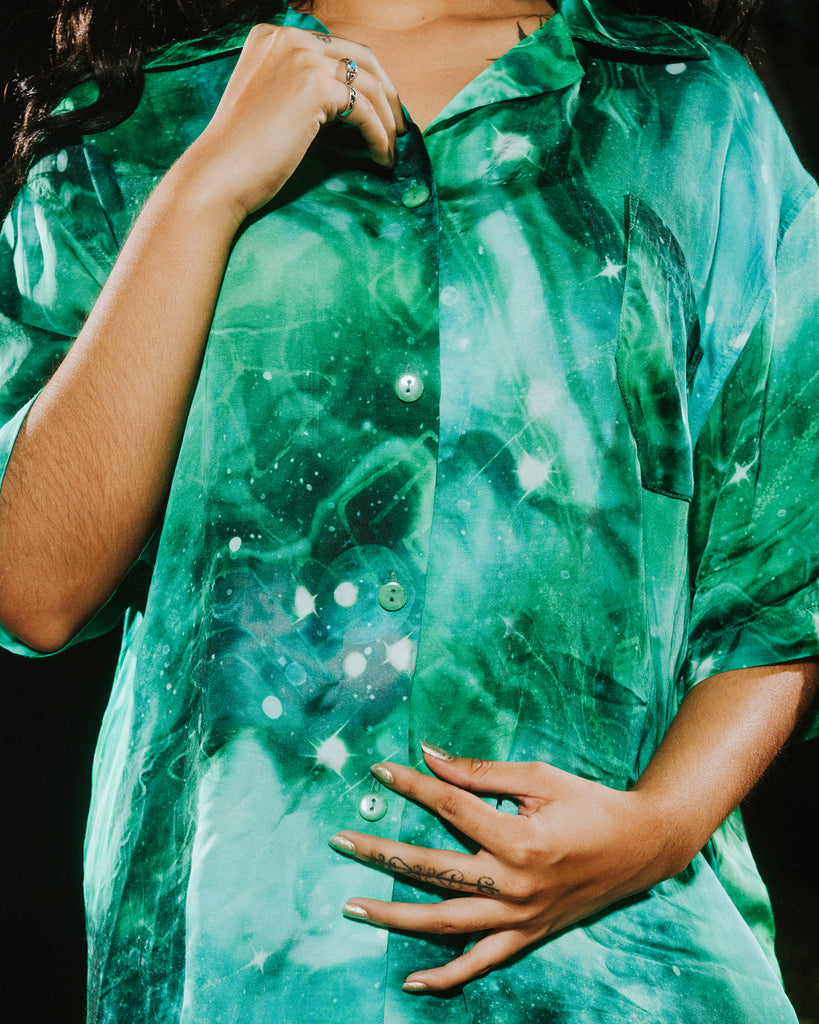 Crafted from silky viscose–rayon satin that feels cool and fluid against the skin, this set features a relaxed button-up top and elastic waist shorts for an effortless drape and luminous finish.