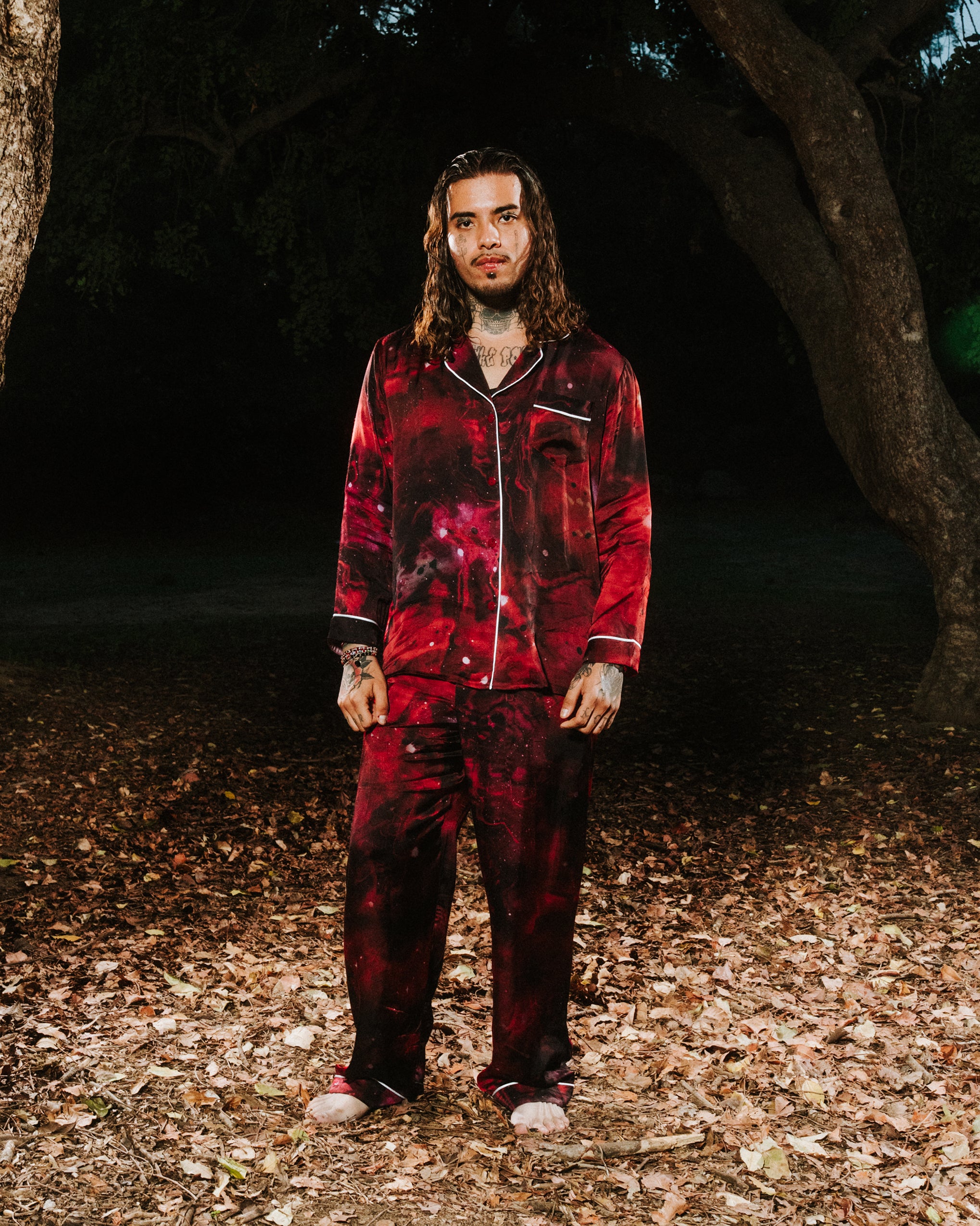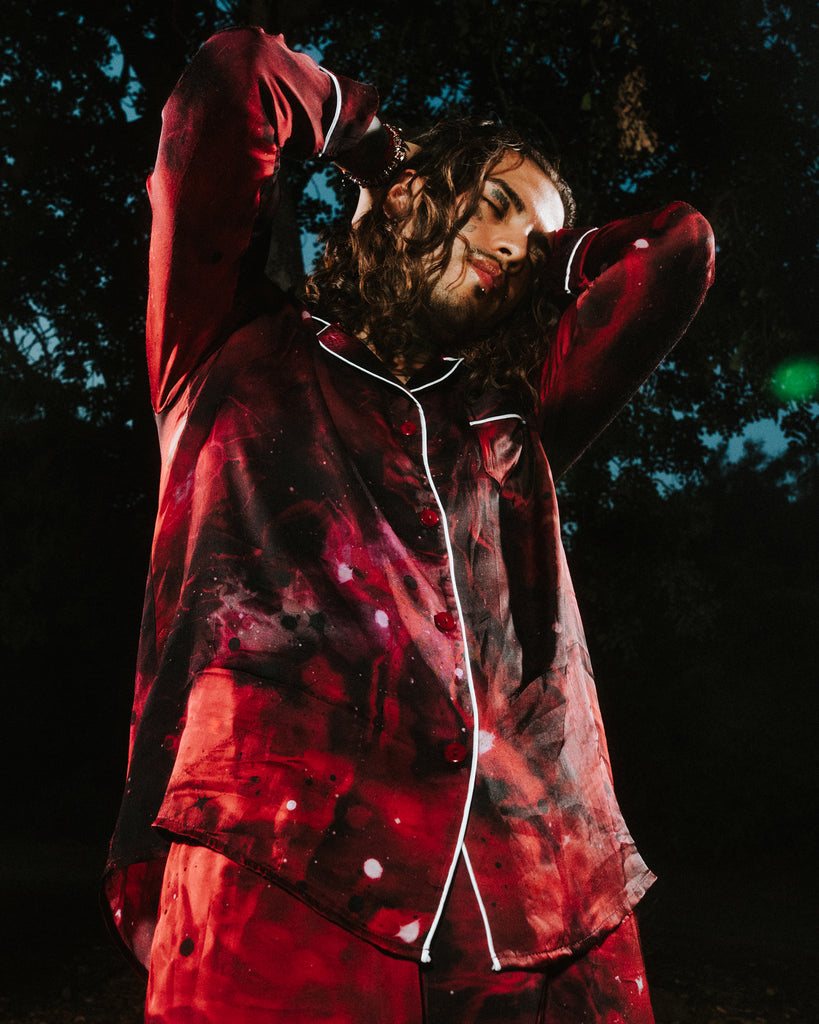 Crafted from silky viscose–rayon satin that feels cool and fluid against the skin, this long-sleeve two-piece features piping details, tonal buttons, and elastic waist pants for an effortless drape and luminous finish.